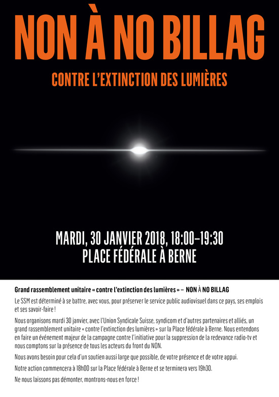 Rejoignez-nous sur la Place Fédérale le 30 janvier à 18h pour dire NON à l’initiative pour la suppression de la redevance ("No Billag") le 4 mars 2018.